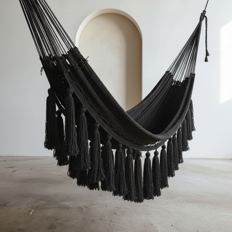 Otro de nuestros modelos más exitosos, es esta hamaca con pompones largos en hilo de algodón. Una vez colgada, no querrás bajarte de ella, su tejido en fibra natural se ajusta perfectamente a tu cuerpo, dándote la mayor comodidad.